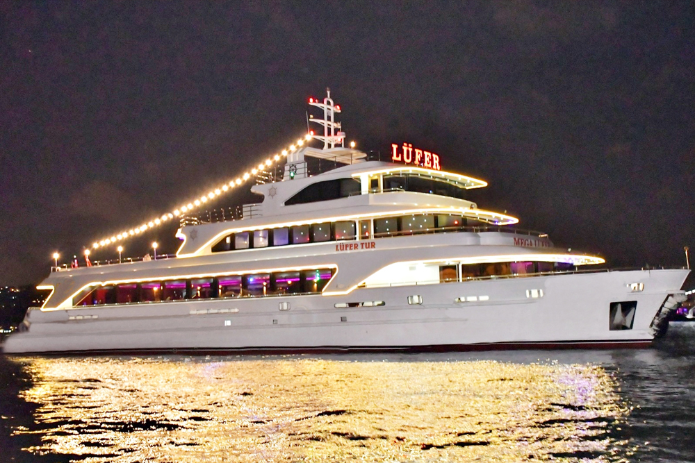 在Mega Lufer博斯普鲁斯海峡晚餐游船表演中享受VIP菜单和无限畅饮的软饮,私人餐桌。品尝美味佳肴,欣赏令人叹为观止的博斯普鲁斯海峡景色,体验精彩的文化表演。轻松找到您的集合点,确保一个无缝且难忘的夜晚。